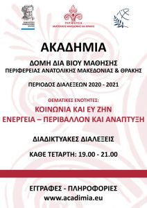 Την Τετάρτη 16 Δεκεμβρίου 2020 ξεκινούν διαδικτυακά οι διαλέξεις του 6ου κύκλου της Ακαδημίας – Δομής Διά Βίου Μάθησης της Περιφέρειας Ανατολικής Μακεδονίας και Θράκης.